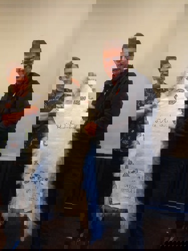 Her får jeg gaven overrakt da jeg gikk av som fylkesleder i 2023, fra Rakel Nystabakk.
